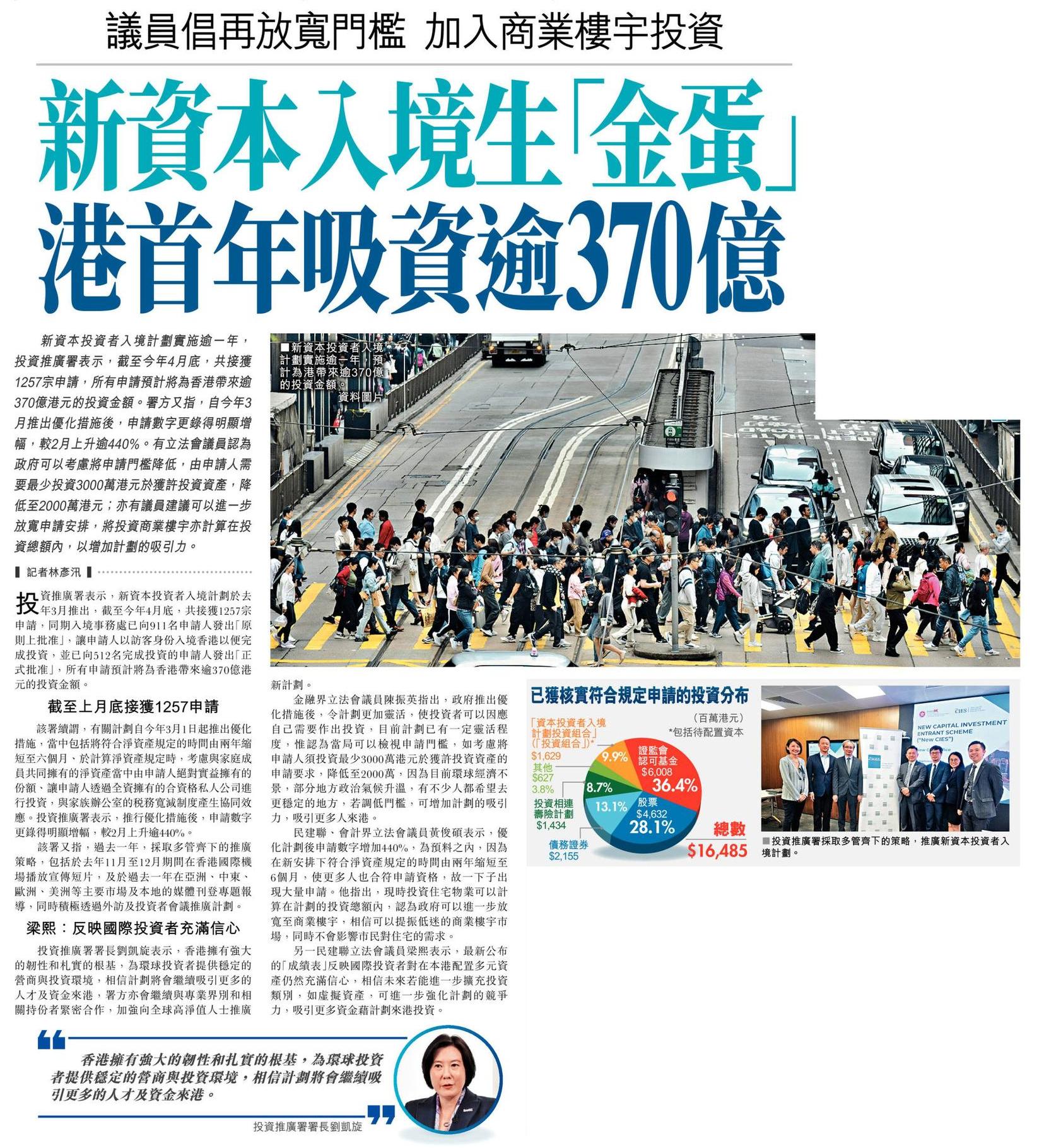 新資本入境生「金蛋」 港首年吸資逾370億 議員倡再放寬門檻 加入商業樓宇投資