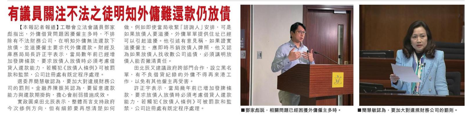 有議員關注不法之徒明知外傭難還款仍放債