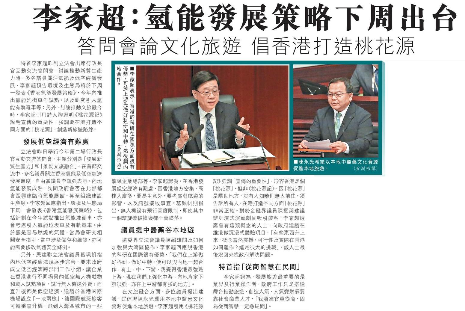李家超:氫能發展策略下周出台 答問會論文化旅遊 倡香港打造桃花源