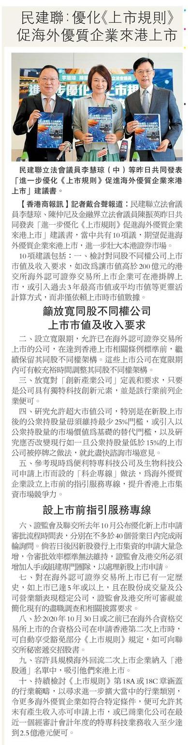 民建聯:優化《上市規則》 促海外優質企業來港上市