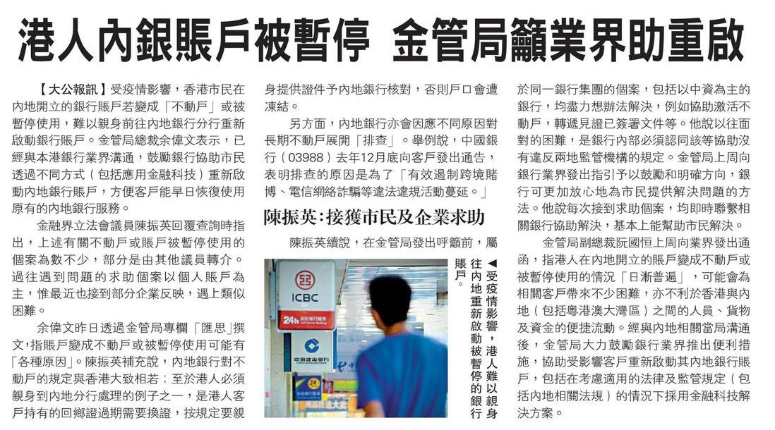 港人內銀賬戶被暫停 金管局籲業界助重啟