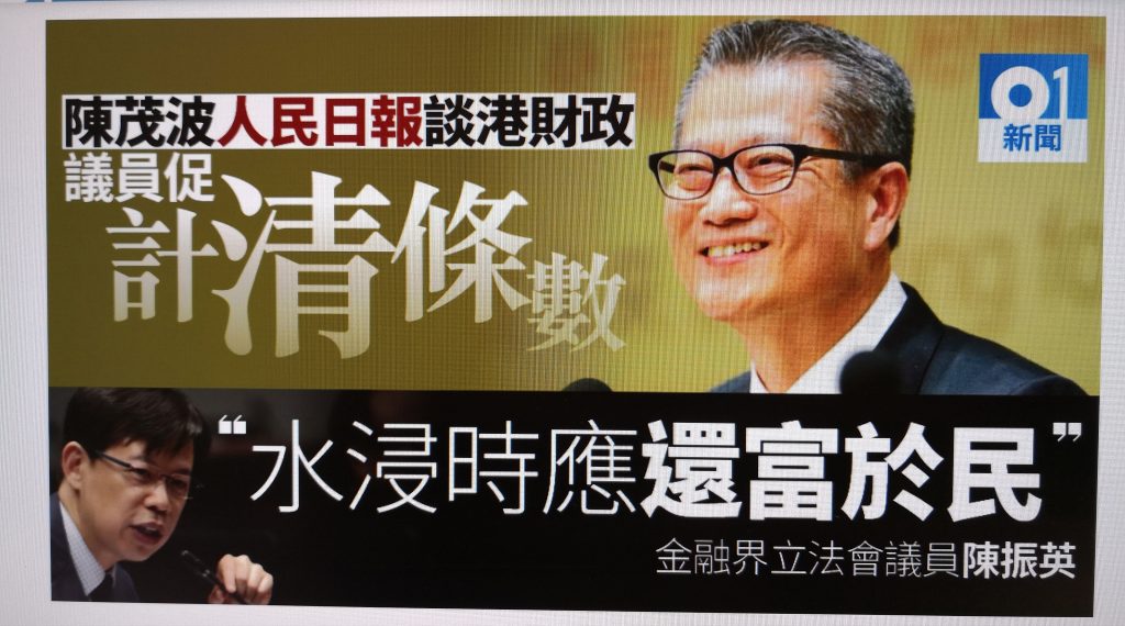 港府擁萬億儲備 議員促陳茂波公開可運用儲備額還富於民 December 9, 2017 December 11, 2017 香港01新聞網引述《人民日報海外版12月8日》報道 — 財政司司長陳茂波專訪 https://www.hk01.com/%E6%B8%AF%E8%81%9E/140039/%E6%B8%AF%E5%BA%9C%E6%93%81%E8%90%AC%E5%84%84%E5%84%B2%E5%82%99-%E8%AD%B0%E5%93%A1%E4%BF%83%E9%99%B3%E8%8C%82%E6%B3%A2%E5%85%AC%E9%96%8B%E5%8F%AF%E9%81%8B%E7%94%A8%E5%84%B2%E5%82%99%E9%A1%8D-%E9%82%84%E5%AF%8C%E6%96%BC%E6%B0%91