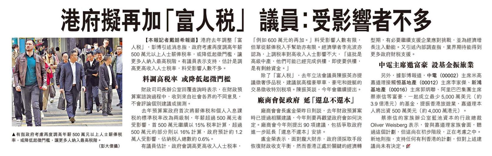 港府擬再加「富人稅」 議員:受影響者不多