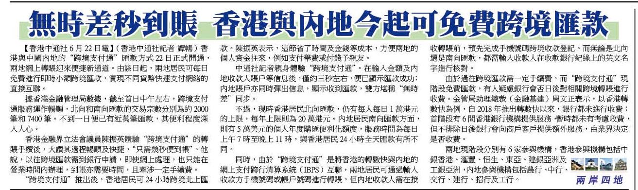 無時差秒到賬 香港與內地今起可免費跨境匯款