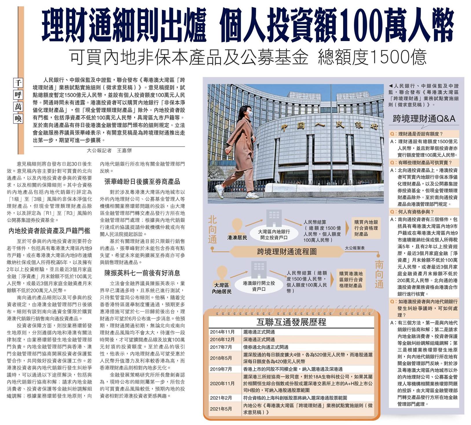 理財通細則出爐 個人投資額100萬人幣 可買內地非保本產品及公募基金 總額度1500億