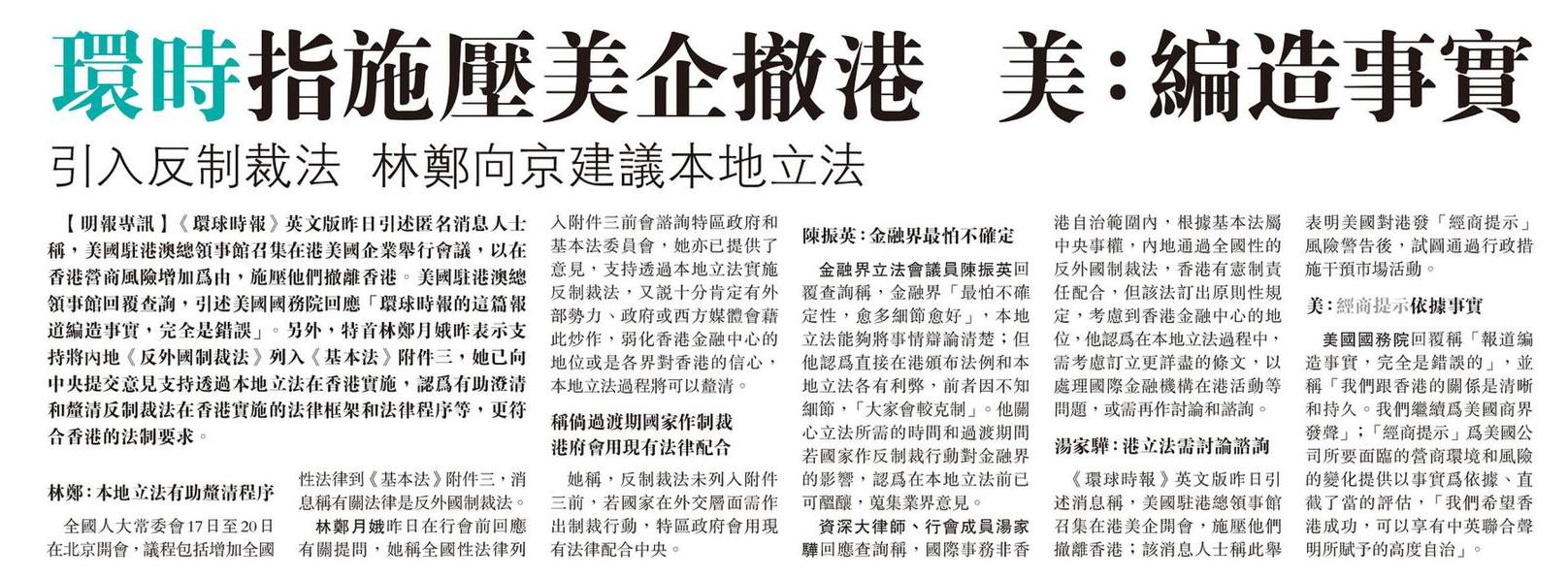 環時指施壓美企撤港 美:編造事實 引入反制裁法 林鄭向京建議本地立法