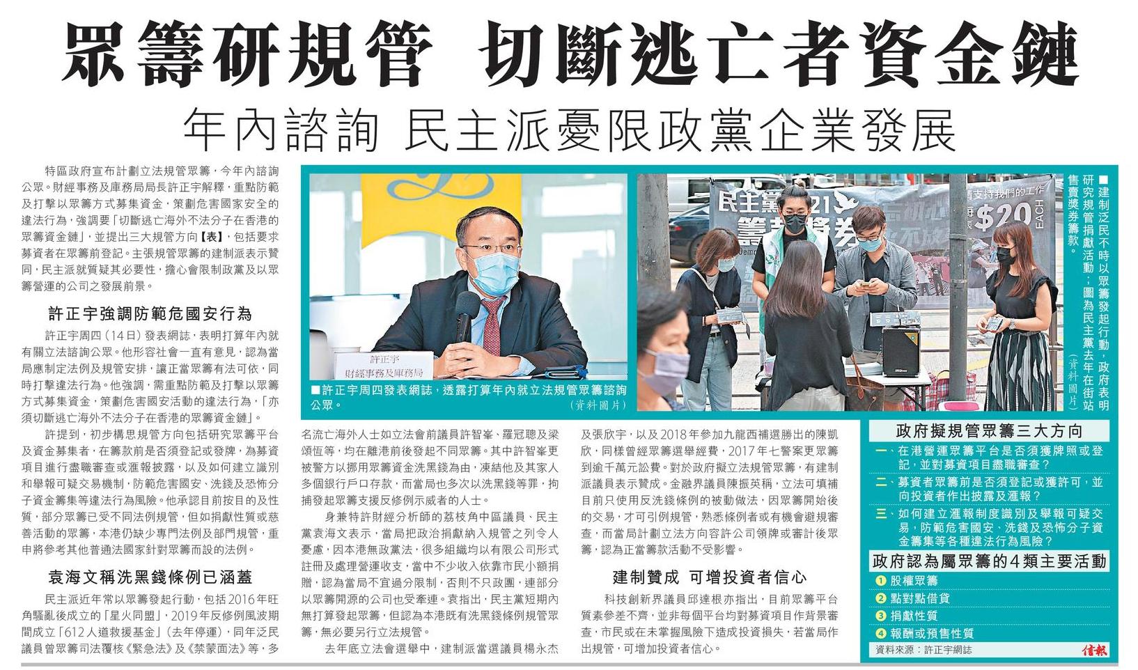 眾籌研規管 切斷逃亡者資金鏈 年內諮詢 民主派憂限政黨企業發展