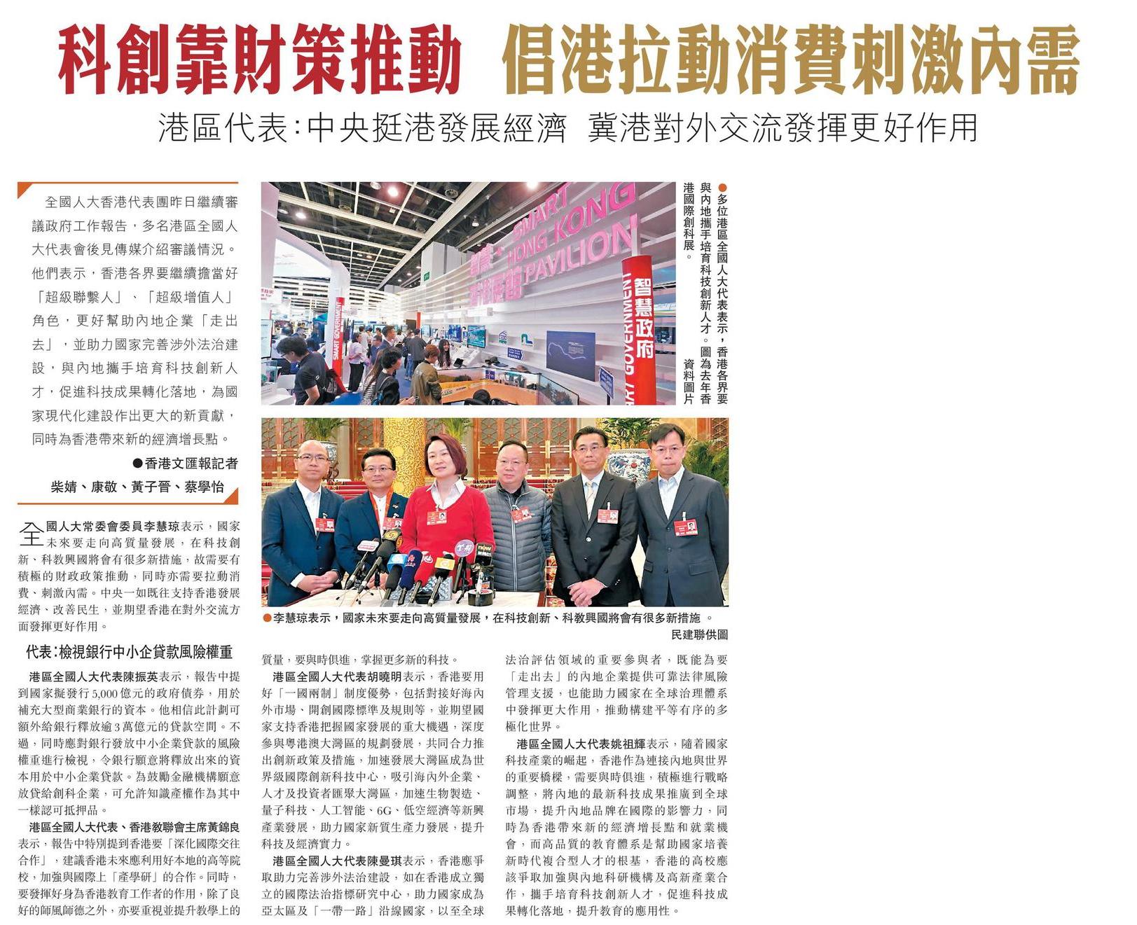 科創靠財策推動 倡港拉動消費刺激內需 港區代表:中央挺港發展經濟 冀港對外交流發揮更好作用