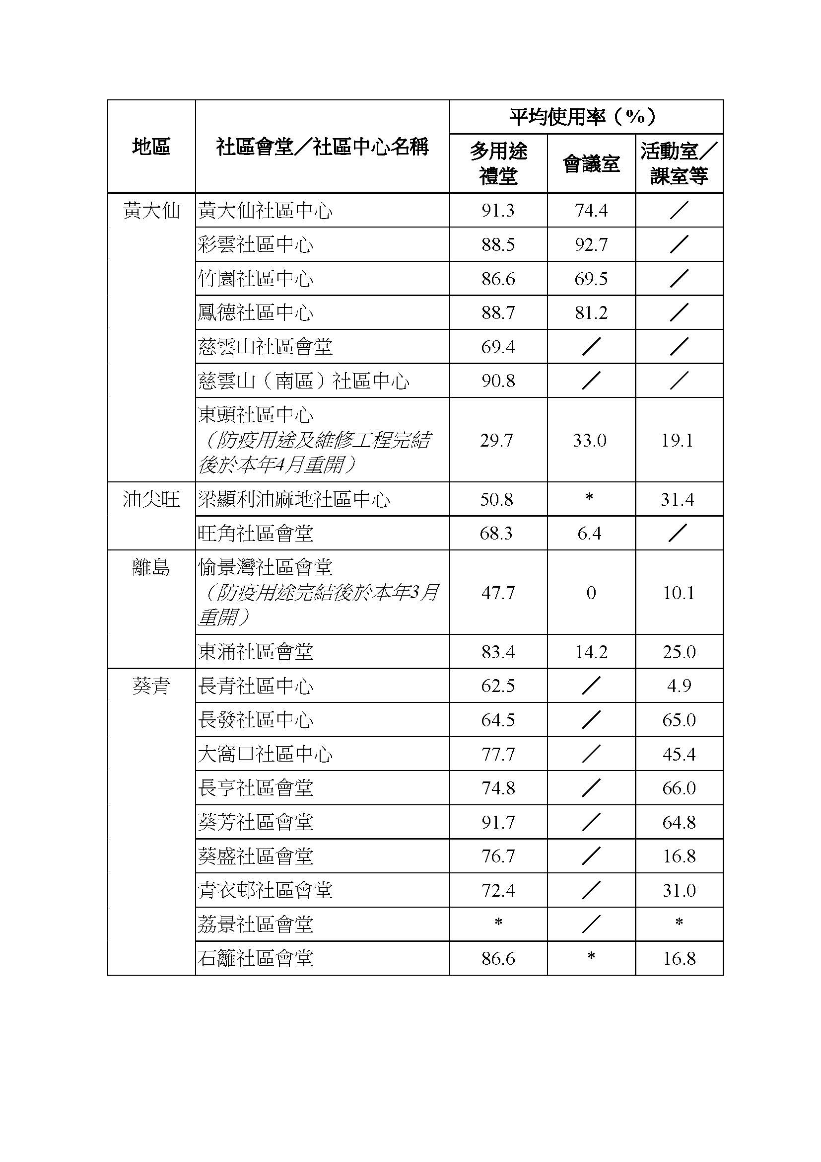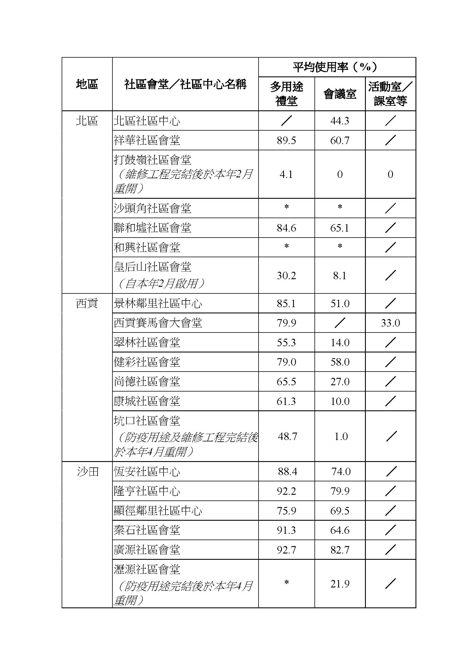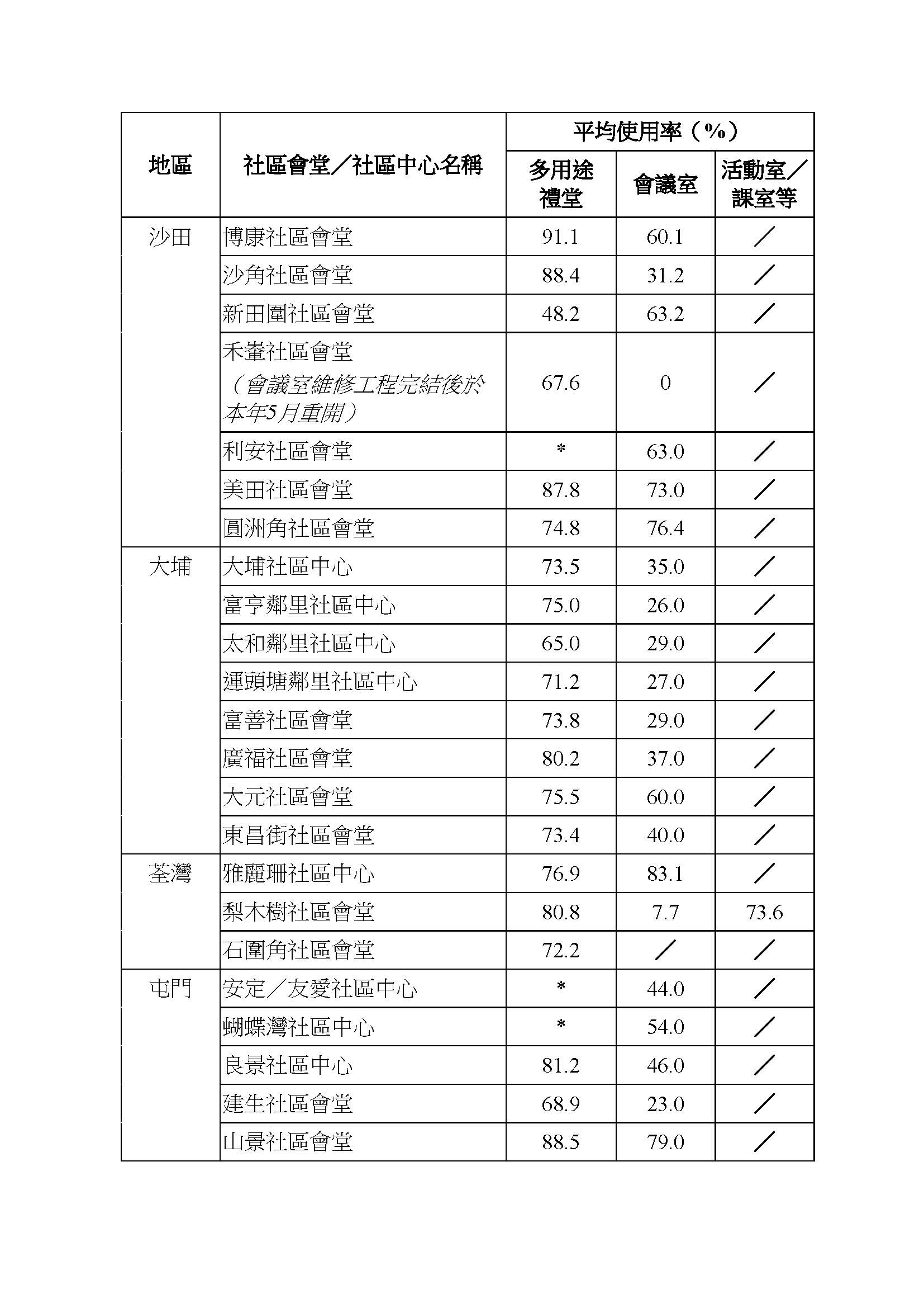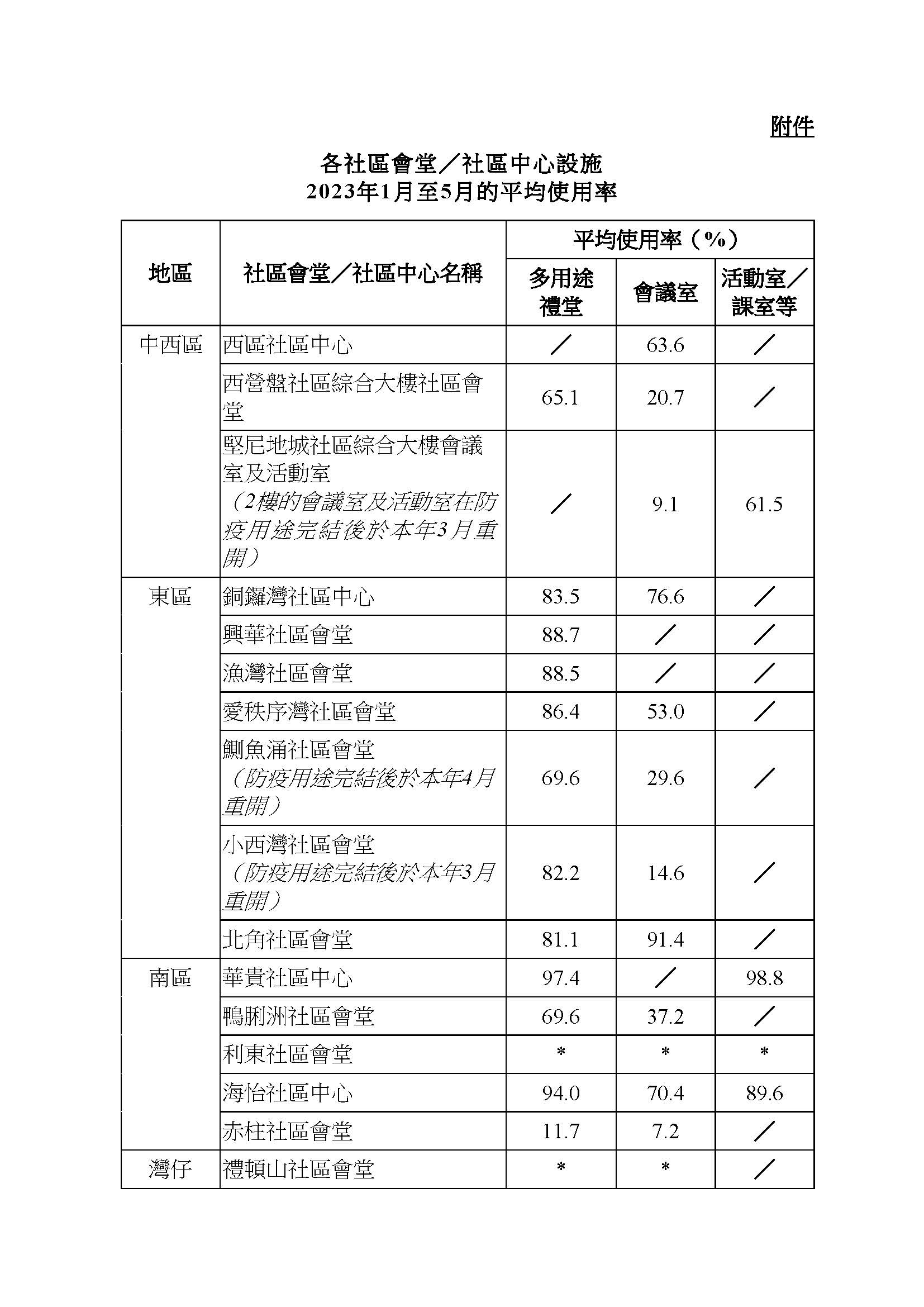 (一) 2023年首5個月,全港社區會堂/社區中心(以下簡稱「會堂」)的多用途禮堂、會議室及其他設施(包括活動室/課室等)的平均使用率分別為76.3%、42.6%及44.5%。各區個別會堂的設施在2023年1月至5月的平均使用率載於附件。