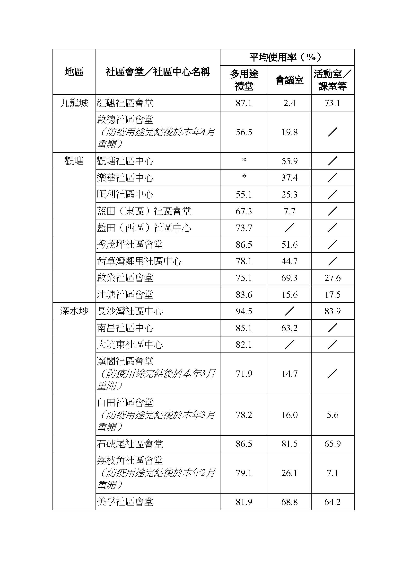 據悉,為應對新冠疫情而設立的社區檢測中心及檢測站近月分批停止運作,而相關的社區會堂及社區中心(“會堂/中心”)已交還民政事務總署並重新開放予地區團體租用。然而,民政事務總署的網頁顯示,部分會堂/中心的設施的租用率較低。例如,截至4月3日,堅尼地城社區綜合大樓的部分活動室於整個4月只有不足3%的可供租用時段獲租出,但部分其他活動室的可供租用時段幾乎爆滿。就此,政府可否告知本會: