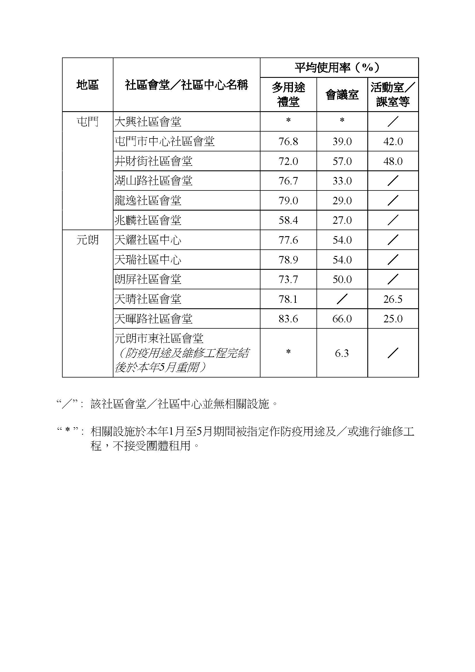 (一)今年1月至5月,每月各區會堂/中心的各項設施(包括禮堂、活動室及會議室)的使用率;