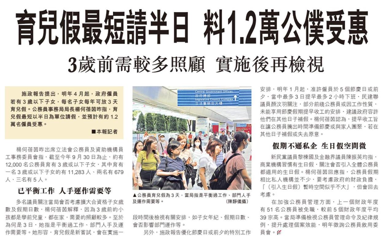 公僕育兒假「平衡家庭人手需要」 子女定3歲以下因學前照顧多 有議員指3天少