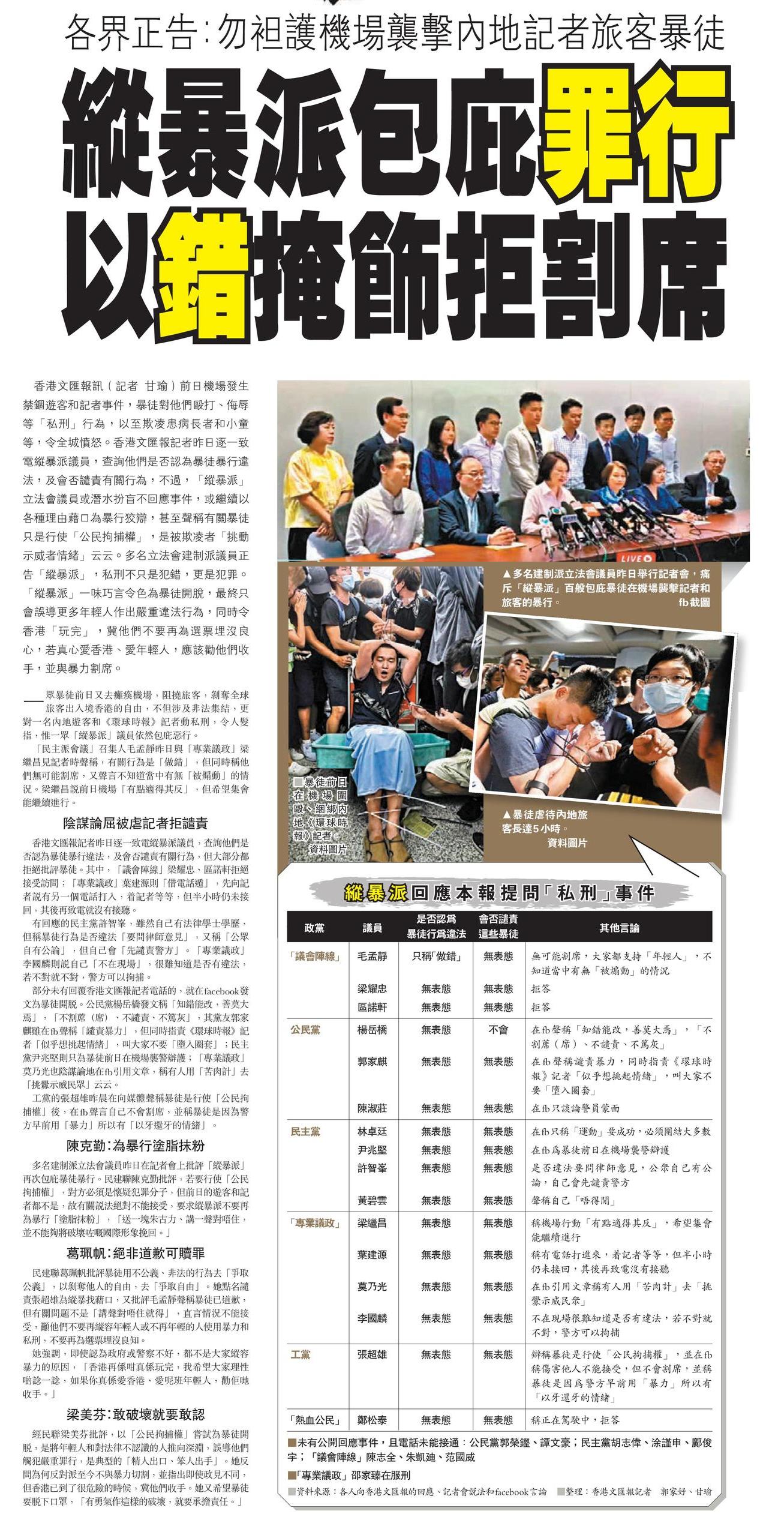 與多名建制派議員舉行記者會 痛斥「縱暴派」百般包疪暴徒在機場襲擊記者和旅客的暴行