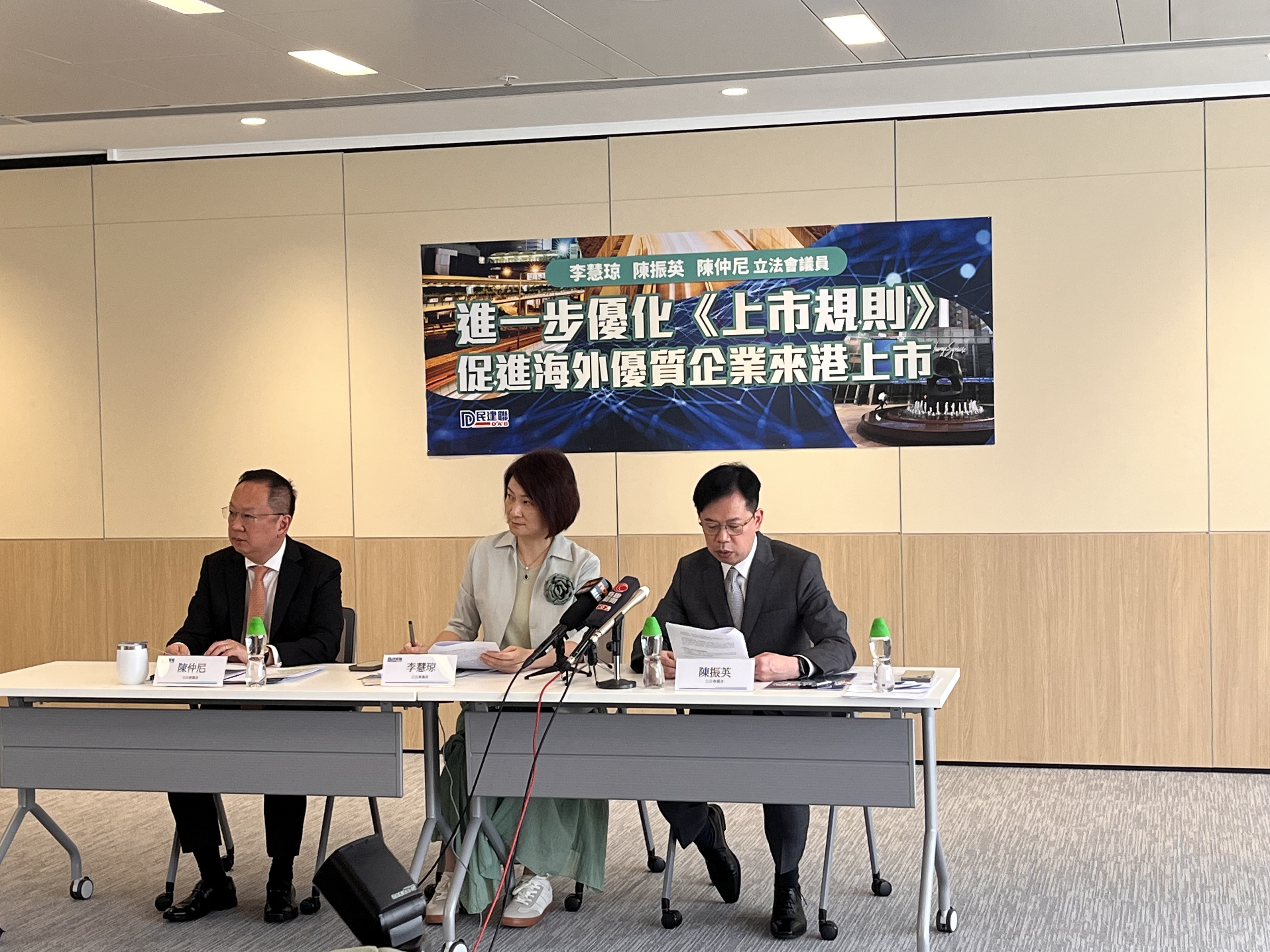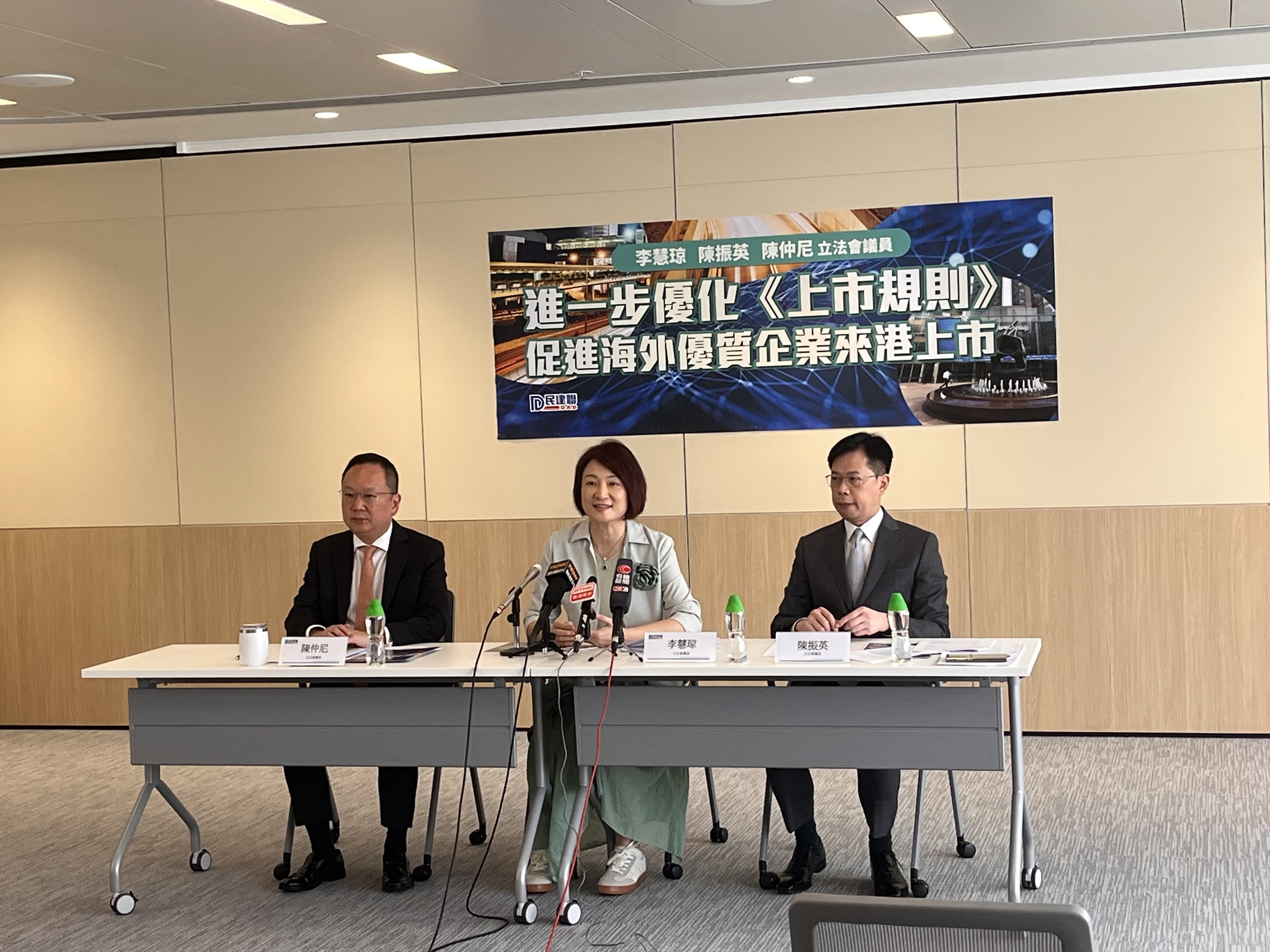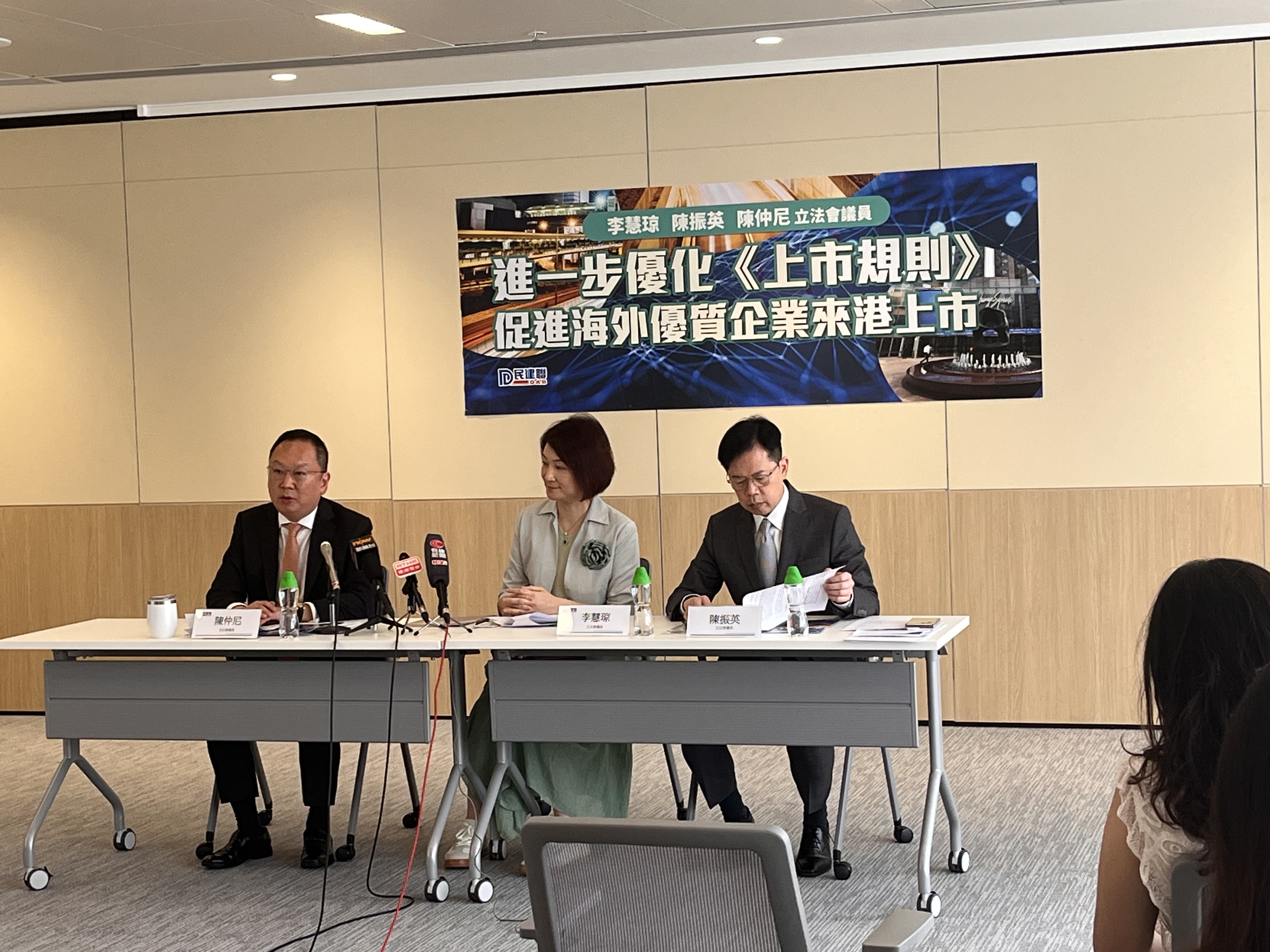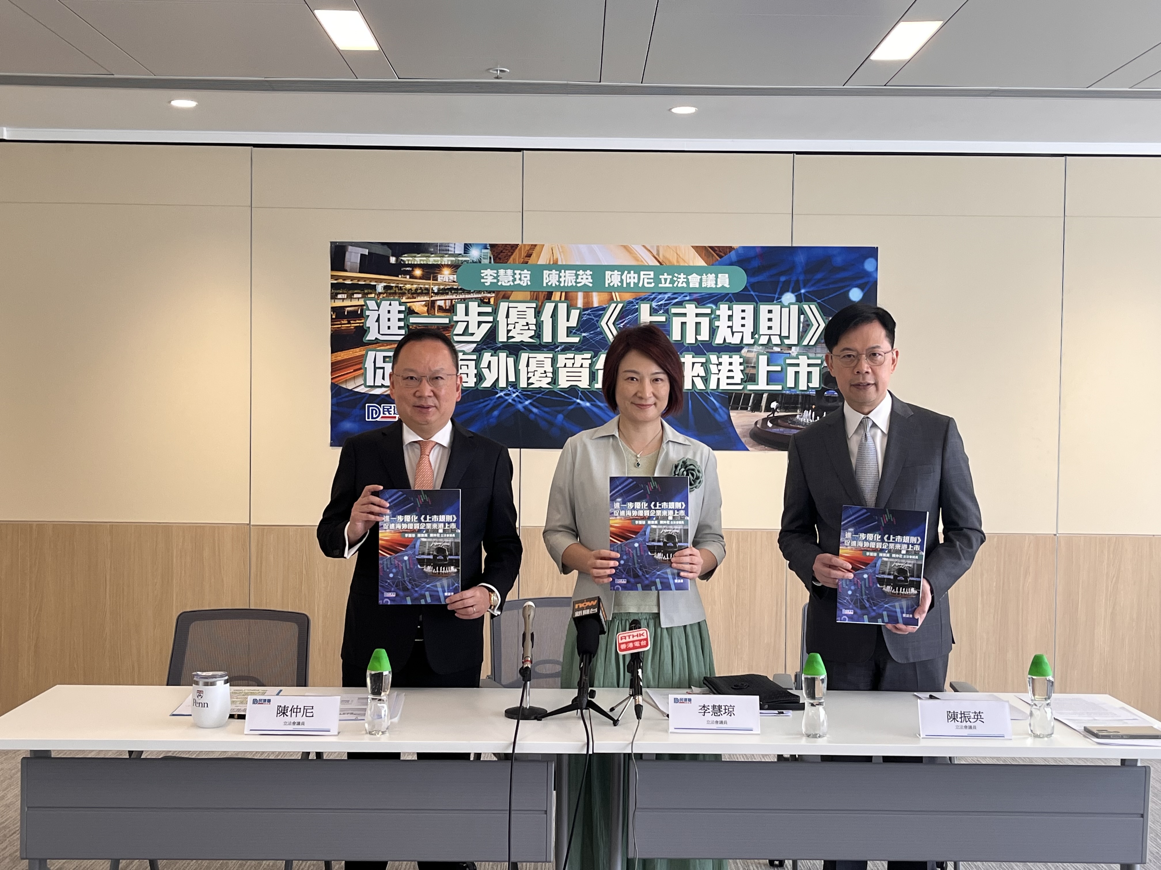 與李慧琼議會及陳仲尼議員共同發佈進一步優化《上市規則》促進海外優質企業來港上市建議書並會見記者,隨後將與政府官員商討落實細節