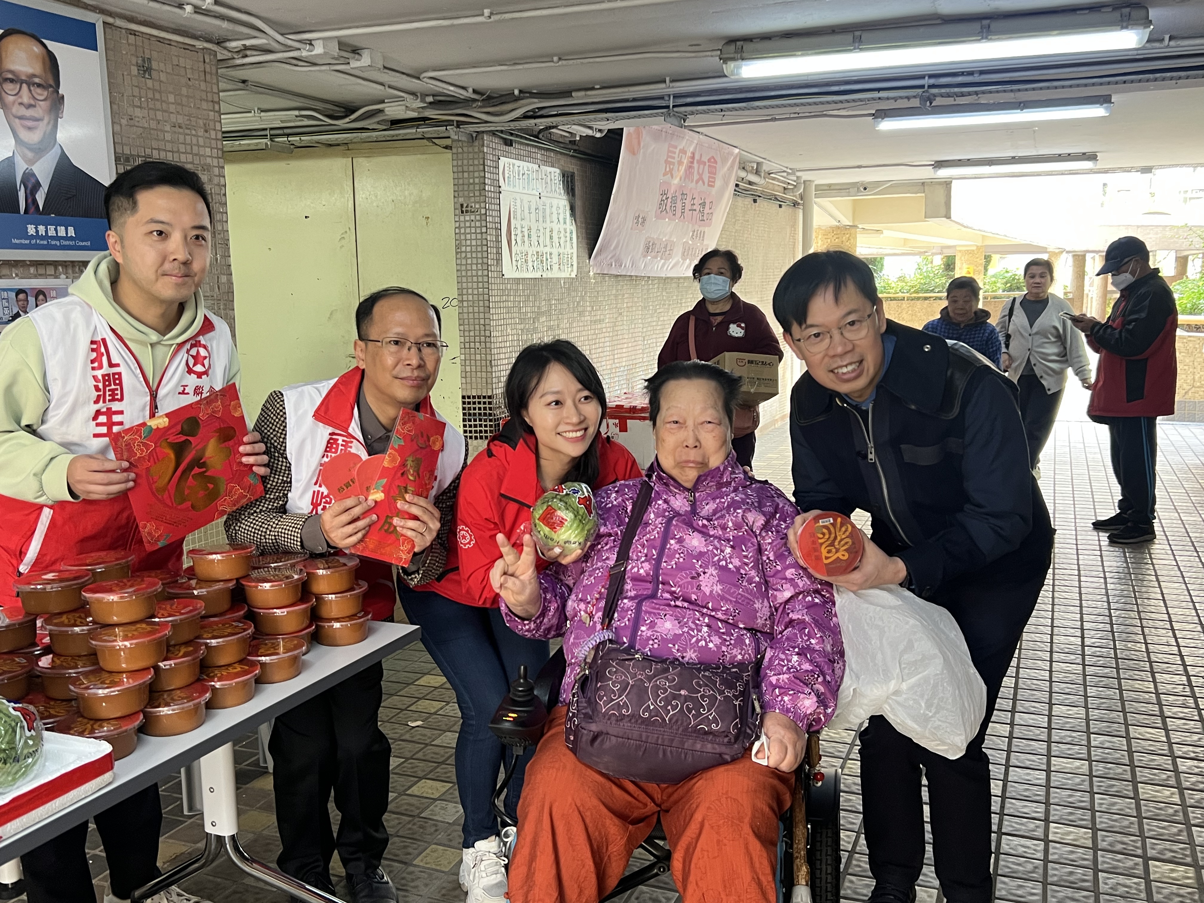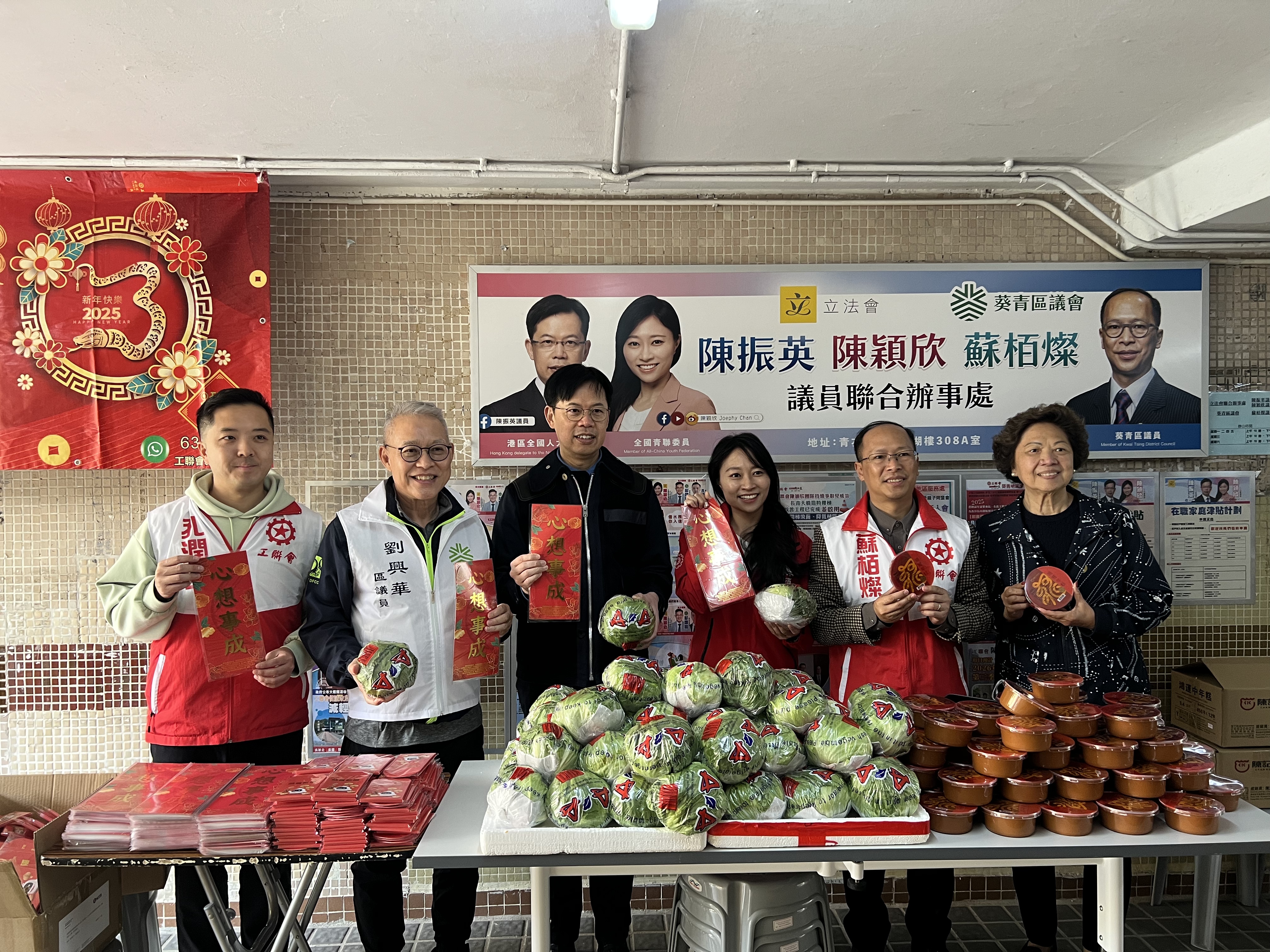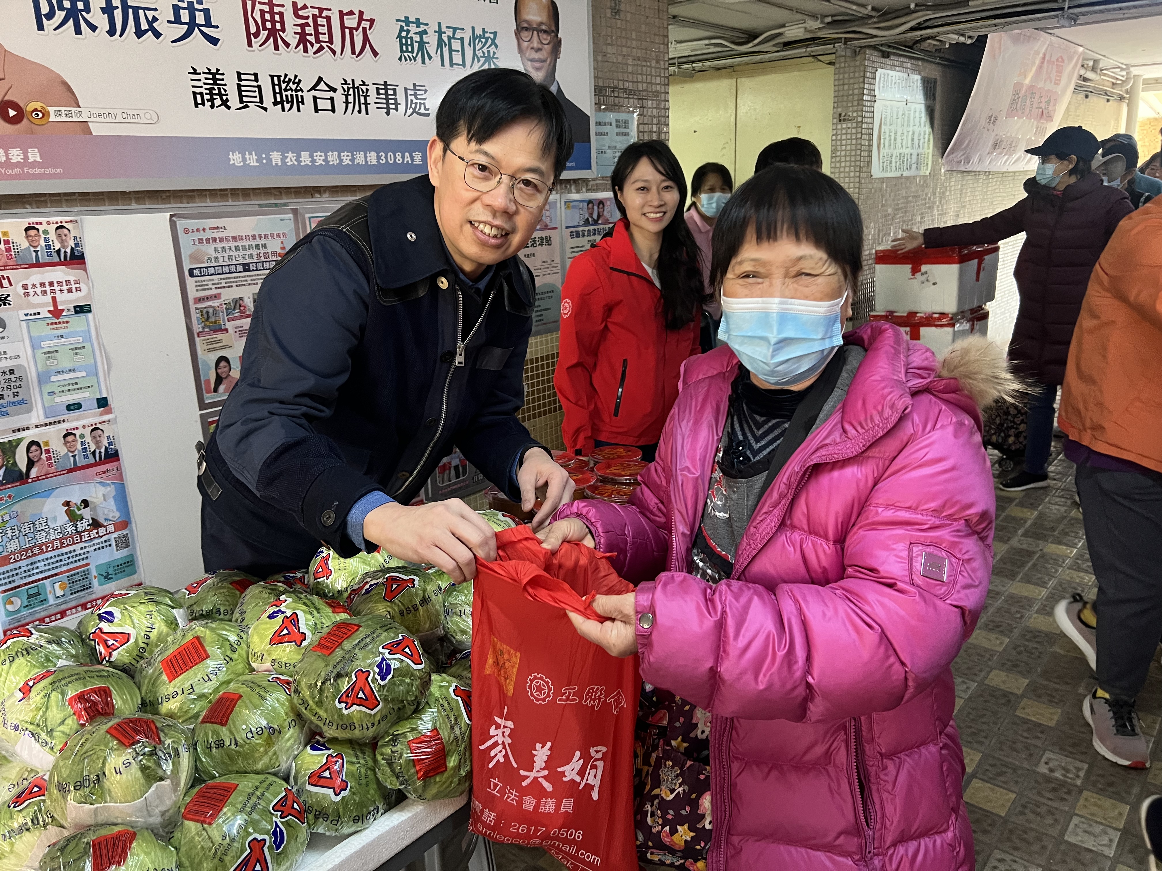 與陳穎欣立法會議員和蘇栢燦區議員一同在青衣長安邨聯合地區辦事處向當地居民派發賀年禮品