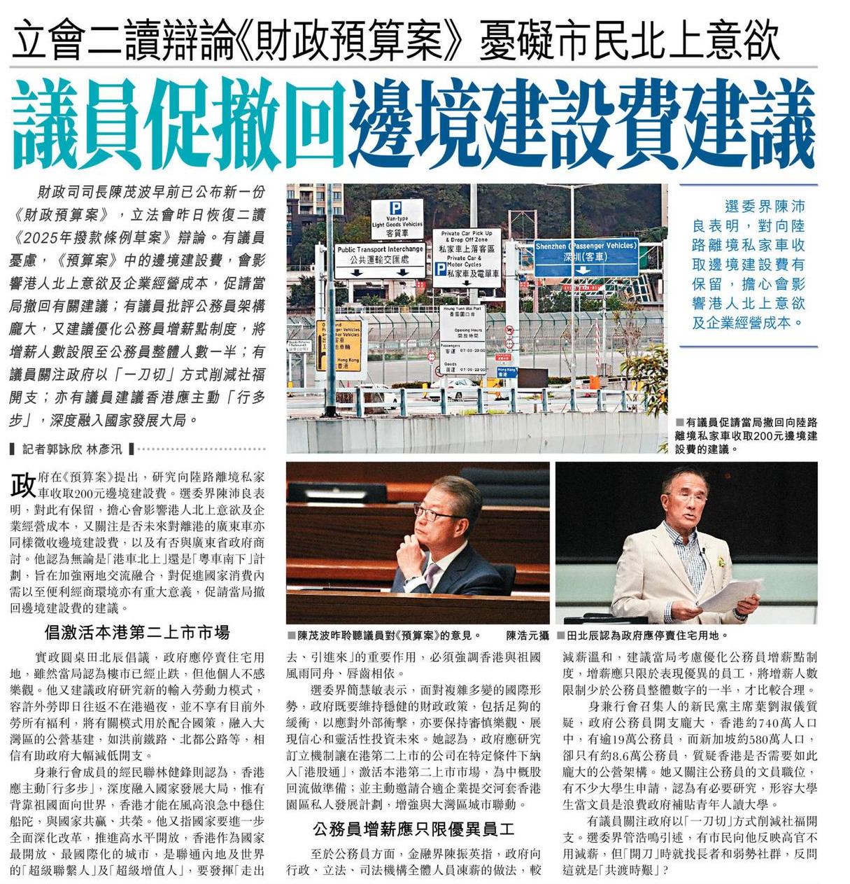 議員促撤回邊境建設費建議 立會二讀辯論《財政預算案》 憂礙市民北上意欲