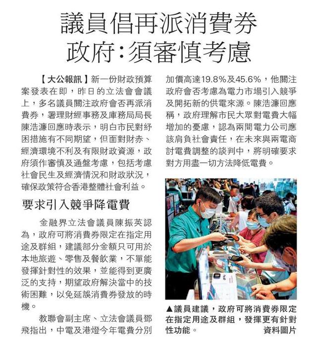 議員倡再派消費券 政府:須審慎考慮