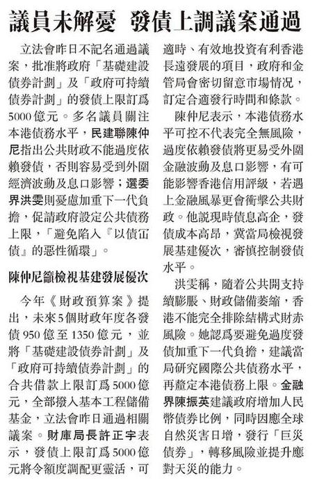 發債上限增至5000億 恐削港信用評級