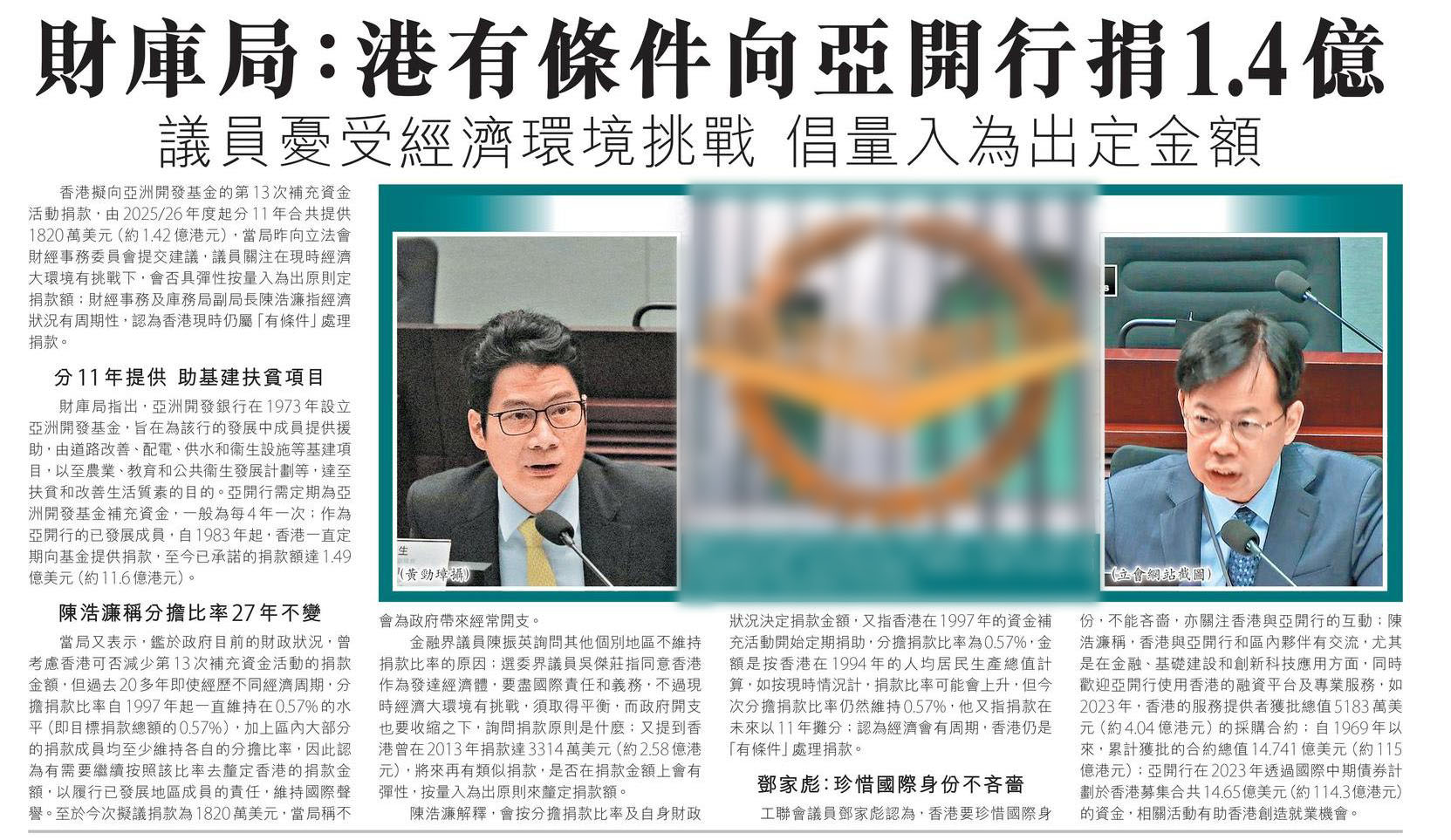財庫局:港有條件向亞開行捐1.4億 議員憂受經濟環境挑戰 倡量入為出定金額