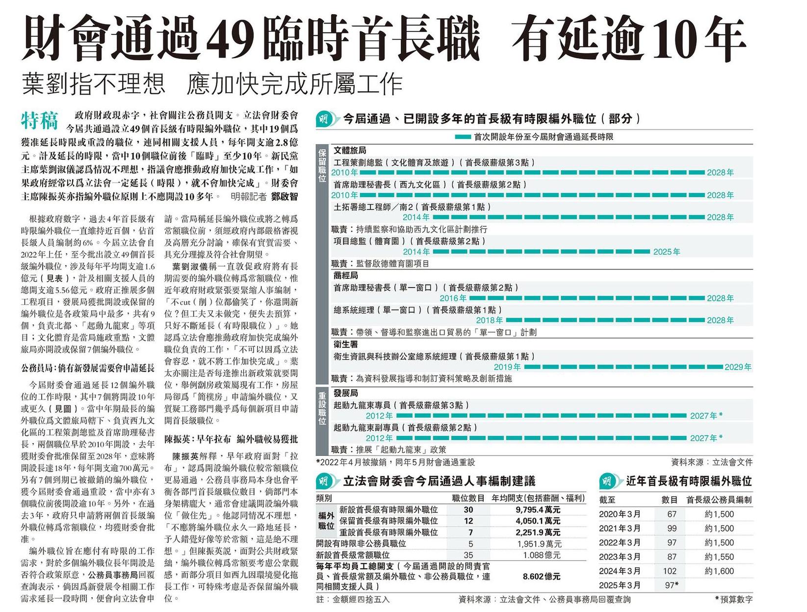 財會通過49臨時首長職 有延逾10年 葉劉指不理想 應加快完成所屬工作
