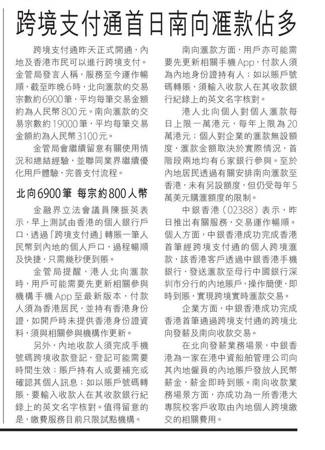 跨境支付通首日南向匯款佔多