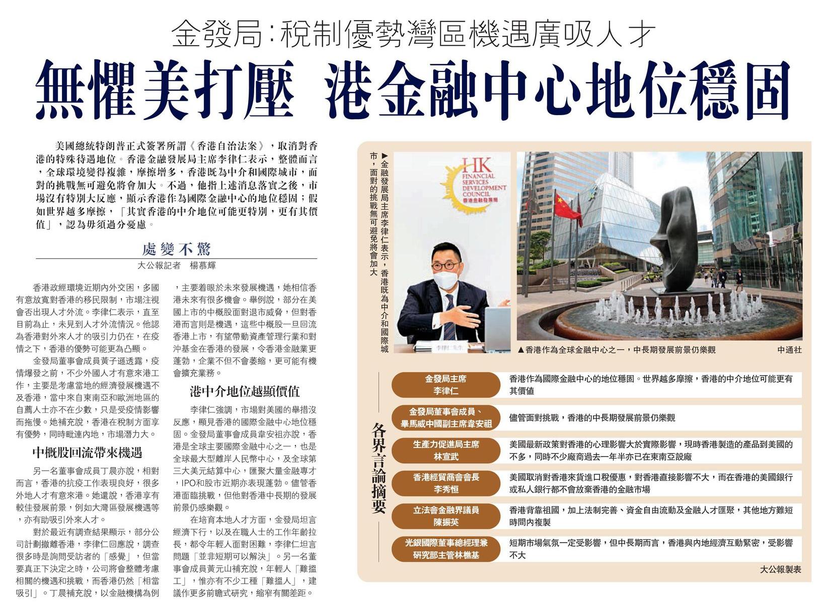 金發局:稅制優勢灣區機遇廣吸人才無懼美打壓港金融中心地位穩固