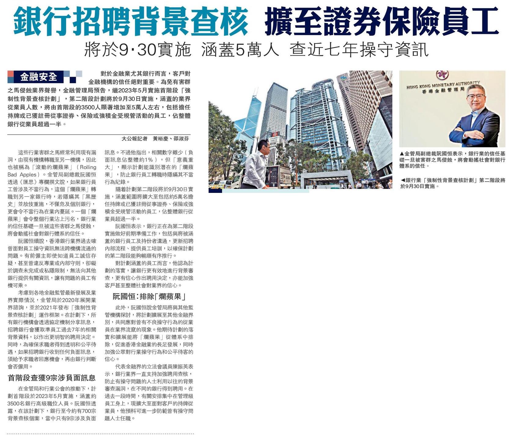 銀行招聘背景查核 擴至證券保險員工 將於9.30實施 涵蓋5萬人 查近七年操守資訊