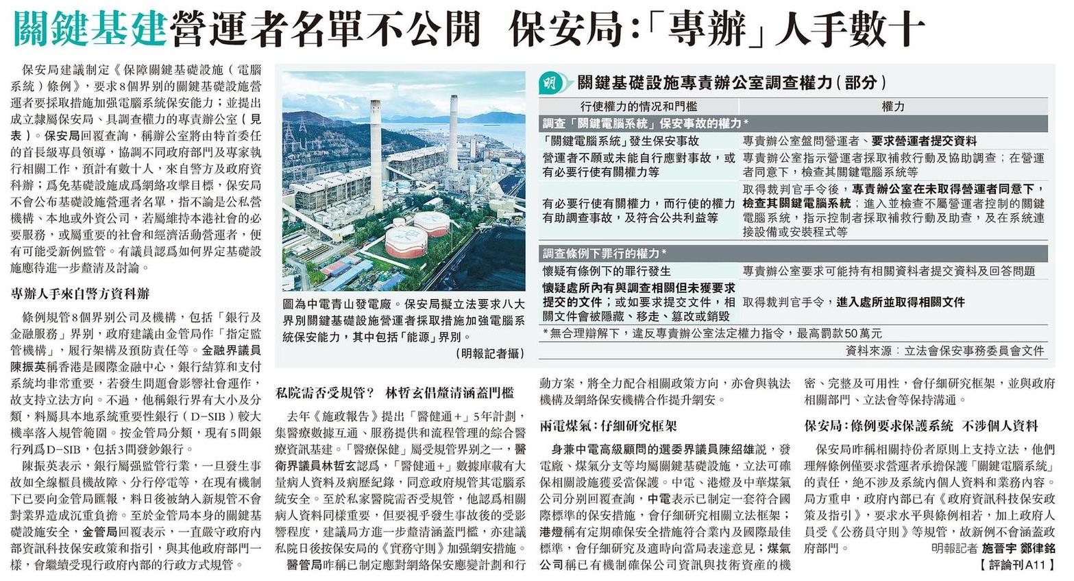 關鍵基建營運者名單不公開 保安局:「專辦」人手數十