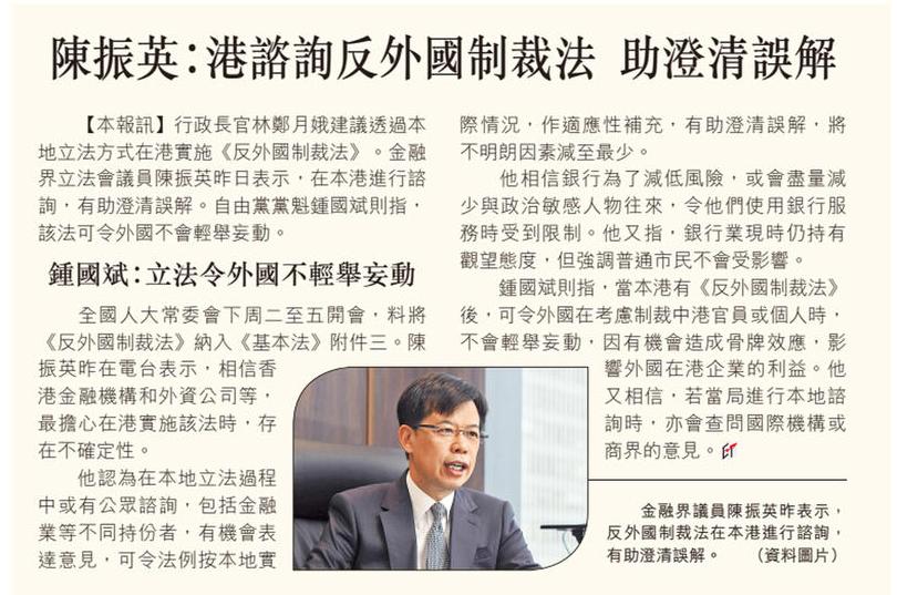 陳振英倡仿歐盟 引入「安全港」條文反制裁