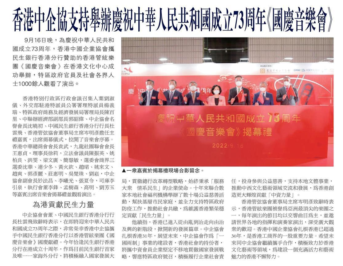 香港中企協支持舉辦慶祝中華人民共和國成立73周年《國慶音樂會》