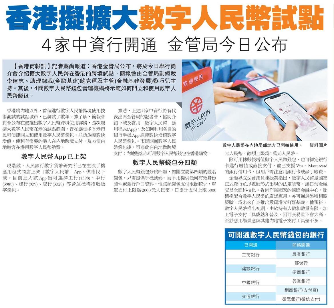 香港擬擴大數字人民幣試點 4家中資行開通 金管局今日公布