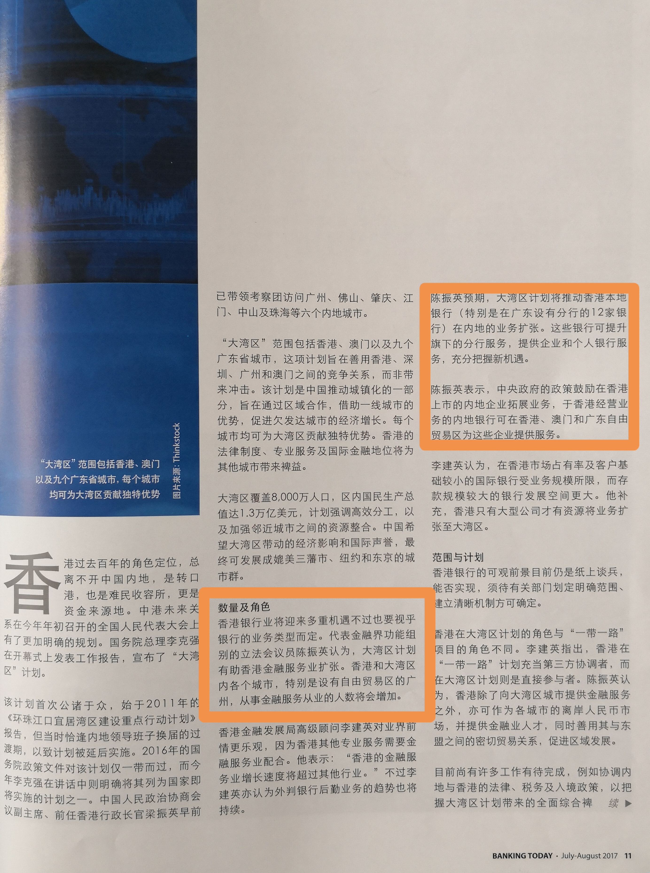 香港銀行學會會刊 “Banking Today” 封面文章 : 發展大灣區建粵港澳合作契機,文章中多次引述本人的意見及觀點 December 4, 2017 December 19, 2017 cof cof cof 香港銀行學會會刊 “Banking Today” 第 95期封面文章 : 發展大灣區建粵港澳合作契機