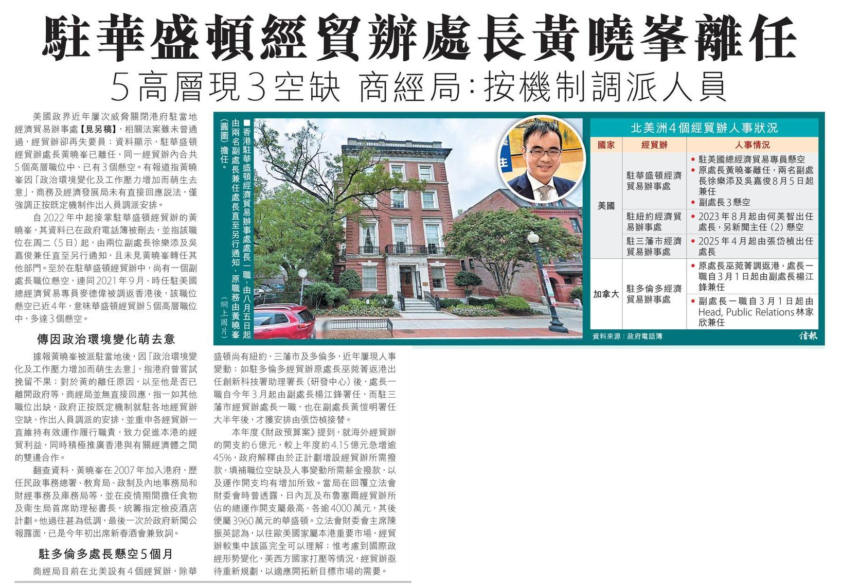 駐華盛頓經貿辦處長黃曉峯離任 5高層現3空缺 商經局:按機制調派人員