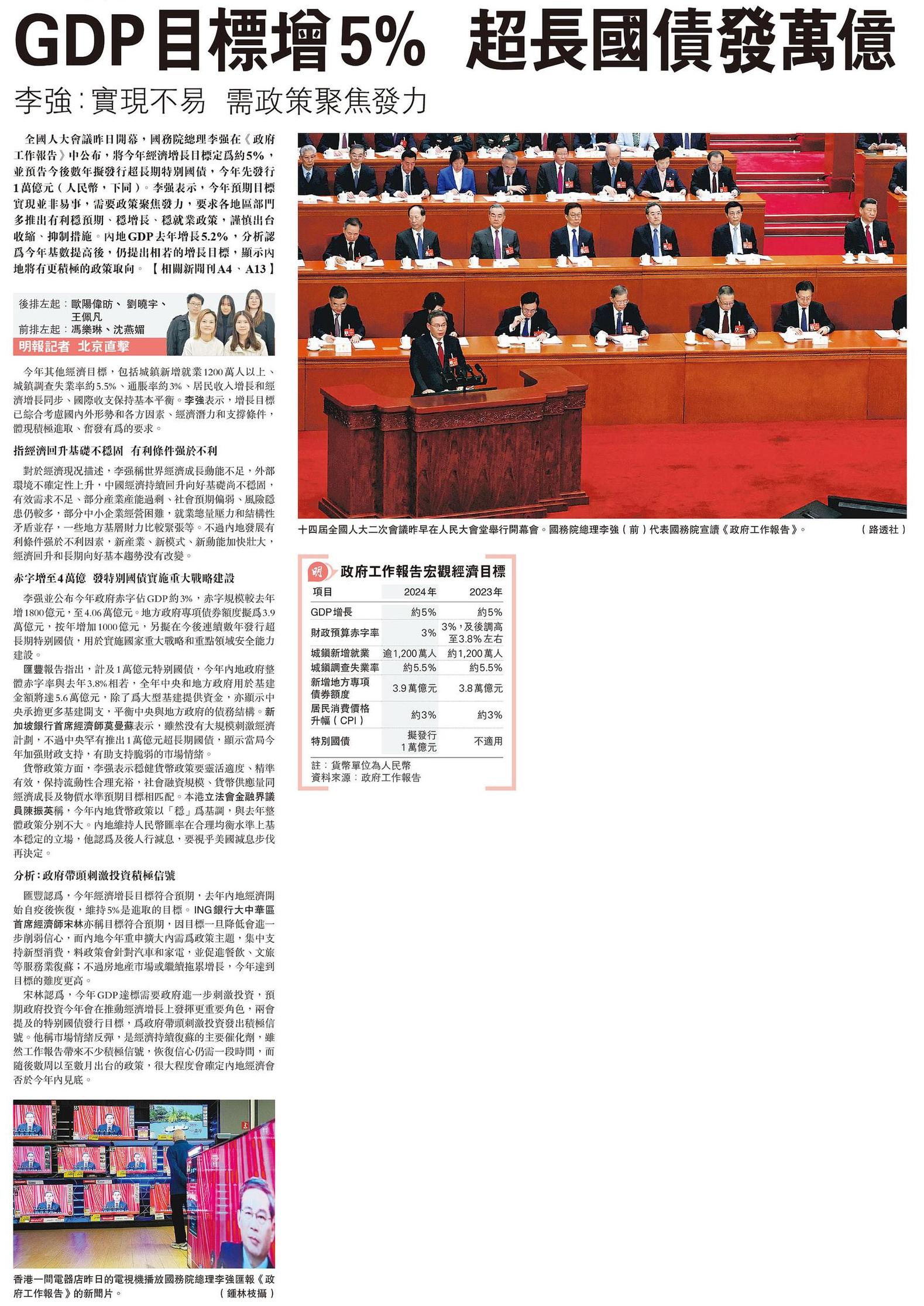 GDP目標增5% 超長國債發萬億 李強:實現不易 需政策聚焦發力