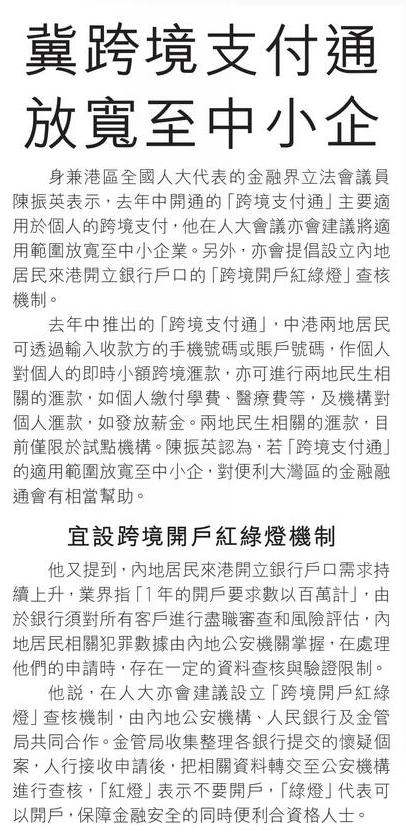 人幣業務資金安排倡至2500億 陳振英:人大會議將提建議擴額度