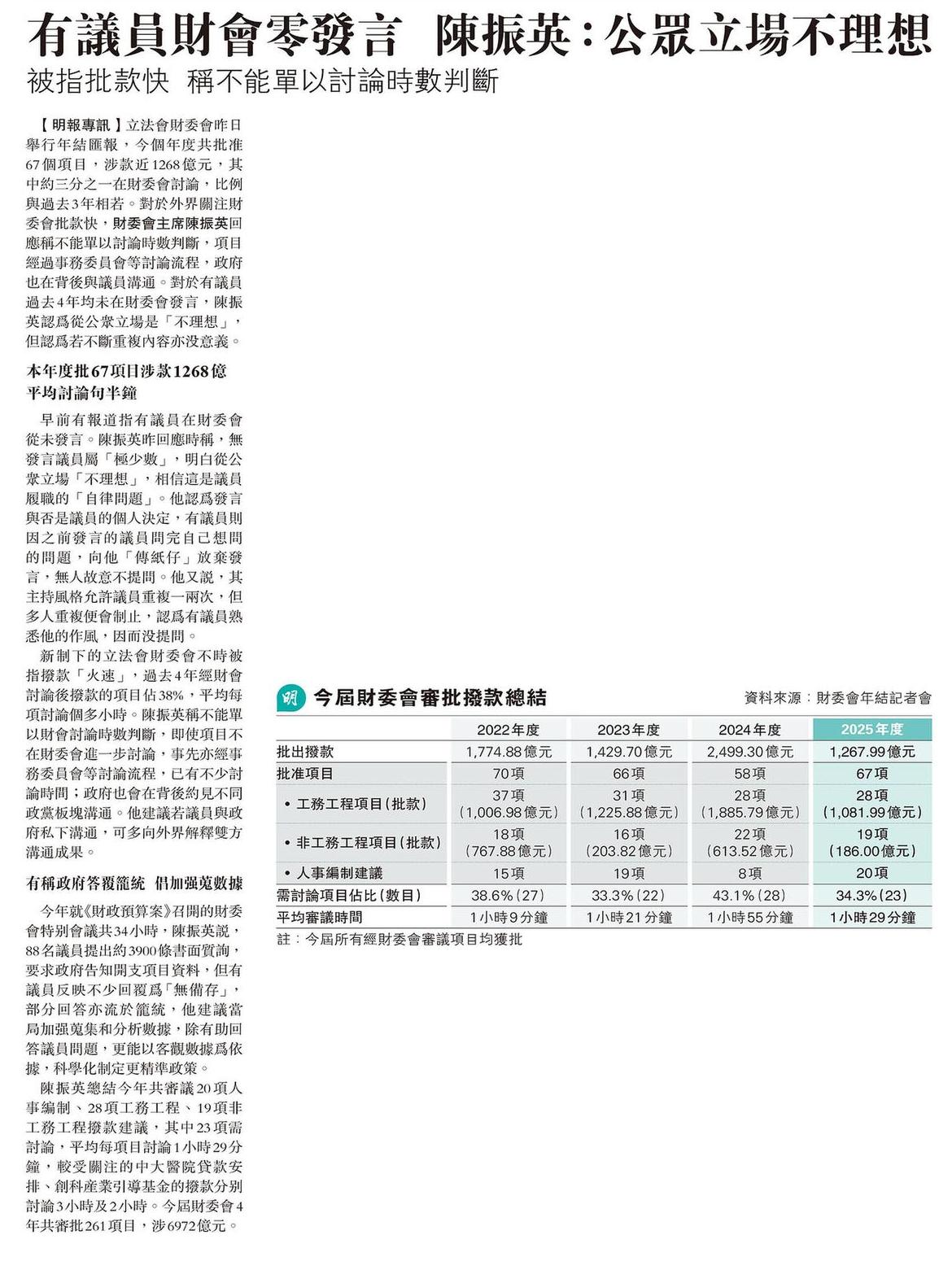 有議員財會零發言 陳振英:公眾立場不理想 被指批款快 稱不能單以討論時數判斷