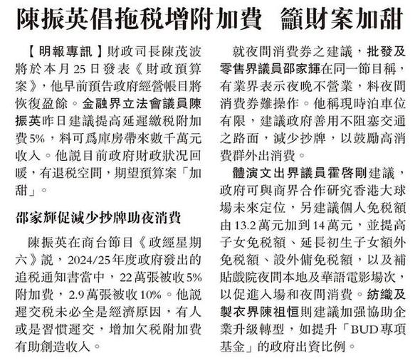 陳振英倡拖稅增附加費 籲財案加甜