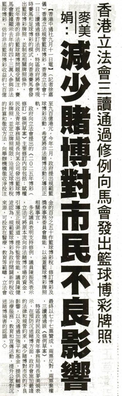 香港立法會三讀通過修例向馬會發出籃球博彩牌照 麥美娟:減少賭博對市民不良影響